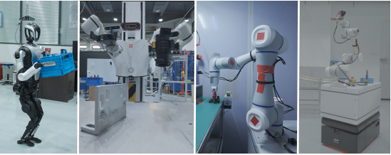 现代复杂生产任务通常需要多种形态的机器人共同参与。本系统攻克了跨平台、跨形态机器人的统一调度难题。产线集成并协调了人形机器人(负责重载搬运)、轮式双臂机器人(负责精细组装)、协作机械臂(负责设备操作)以及复合AGV(负责末端物流)。调度大模型根据这四类机器人的物理边界与硬件属性,建立动态任务分配机制,通过无线网络进行全局实时的任务分发与时序统筹,实现了整个流水线的无缝联动与高效协同。
